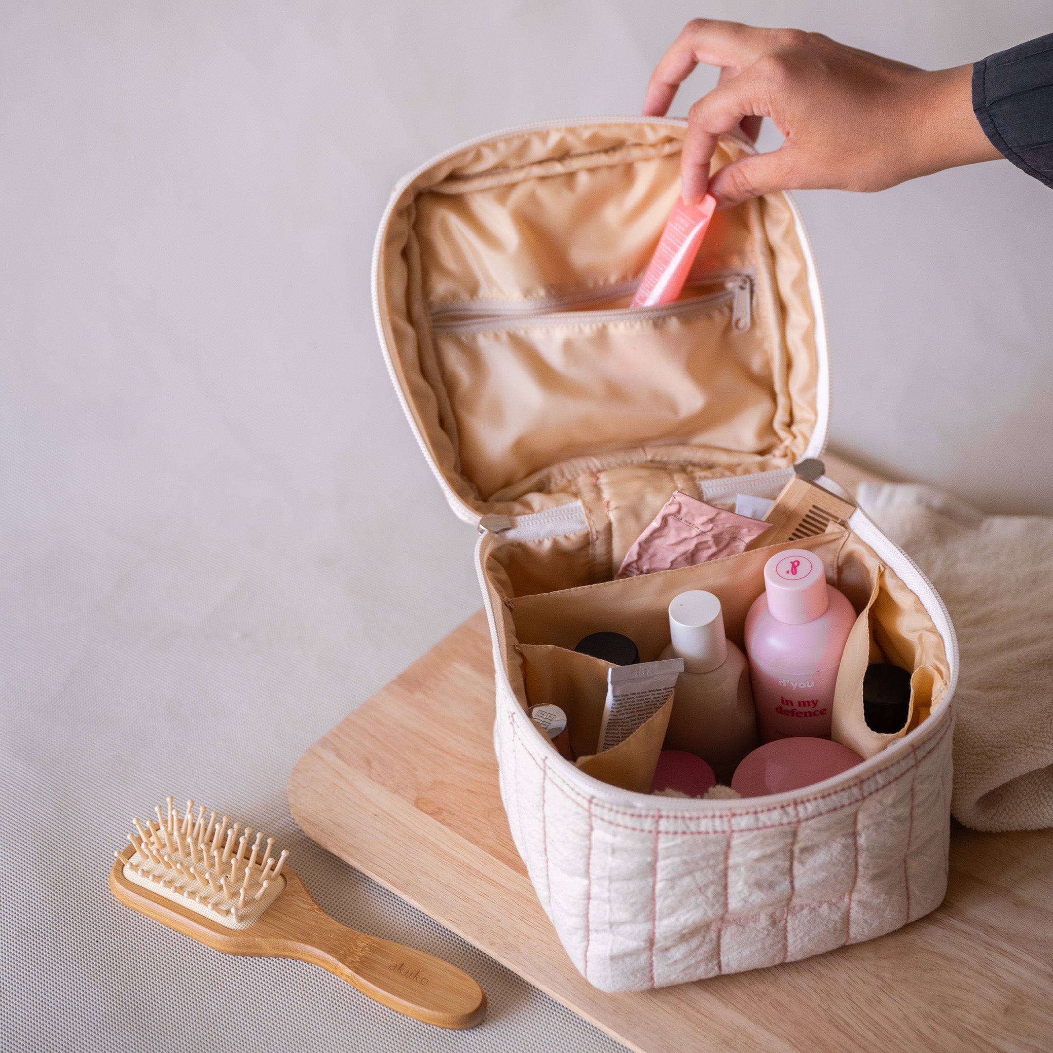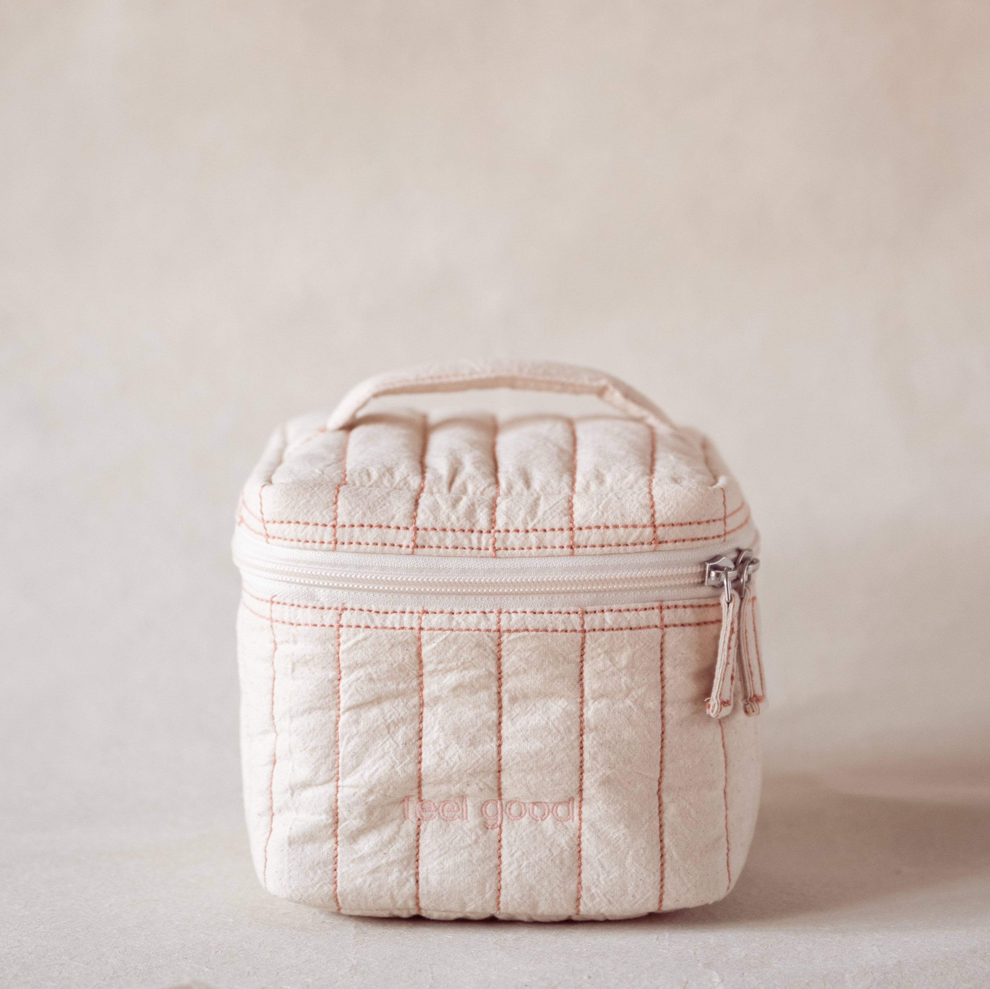 This pretty vanity pouch features a roomy pocket for palettes, two little compartments for lip favourites, and a zipped section for tiny treasures. Crafted in soft, pink-striped cotton and embroidered with feel good, it’s made to make your daily ritual feel just a bit more special.