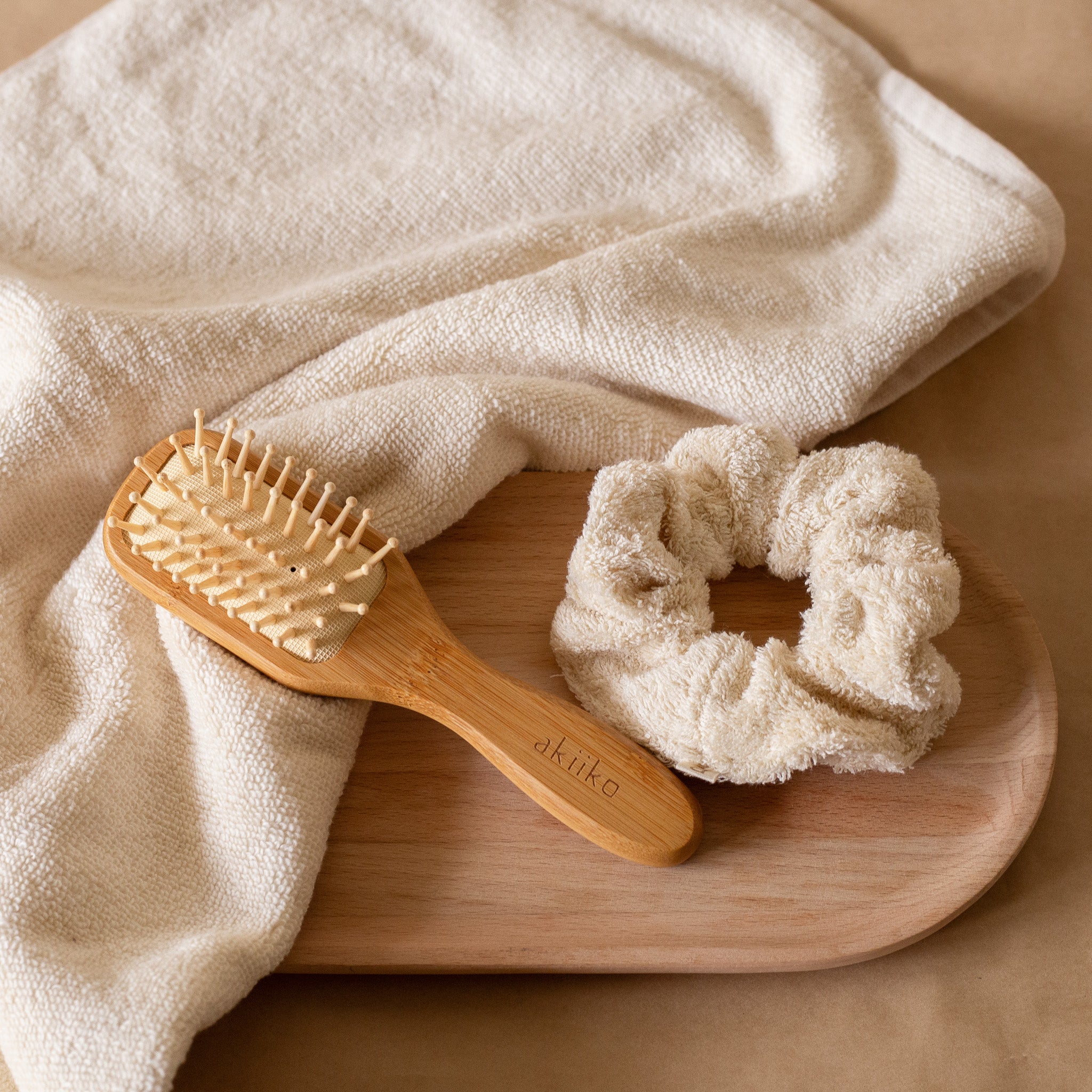 Made to ease you into the night. Start by combing through the day’s tangles with the bamboo hair brush which is gentle on the scalp, then gather your hair softly with the plush terry scrunchie. Indulge in your nighttime skincare ritual, letting each moment be slow and intentional, before patting your skin dry with the ultrasoft zero-twist towel. Every item is crafted to bring calm, comfort, and a little daily indulgence to your evening.