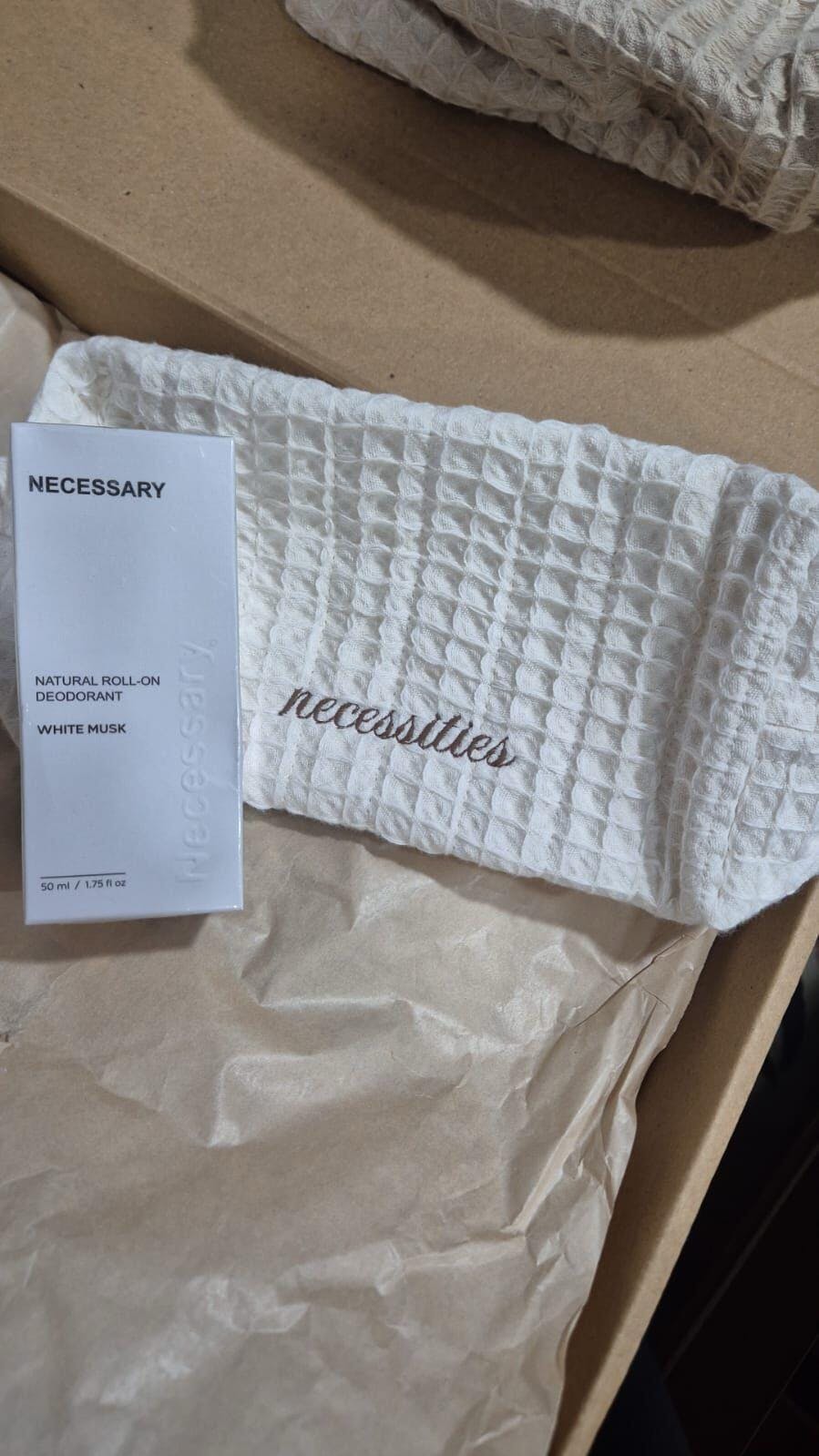 Necessities Waffle Pouch by akiiko:A 100% waffle-woven cotton pouch, lined with water-resistant, wipeable nylon. Compact yet roomy enough for deodorant, minis, or everyday skincare, it’s detailed with necessities embroidery and espresso-toned accents for a warm, minimal finish. Built for those who love their essentials neat, fresh, and within reach.