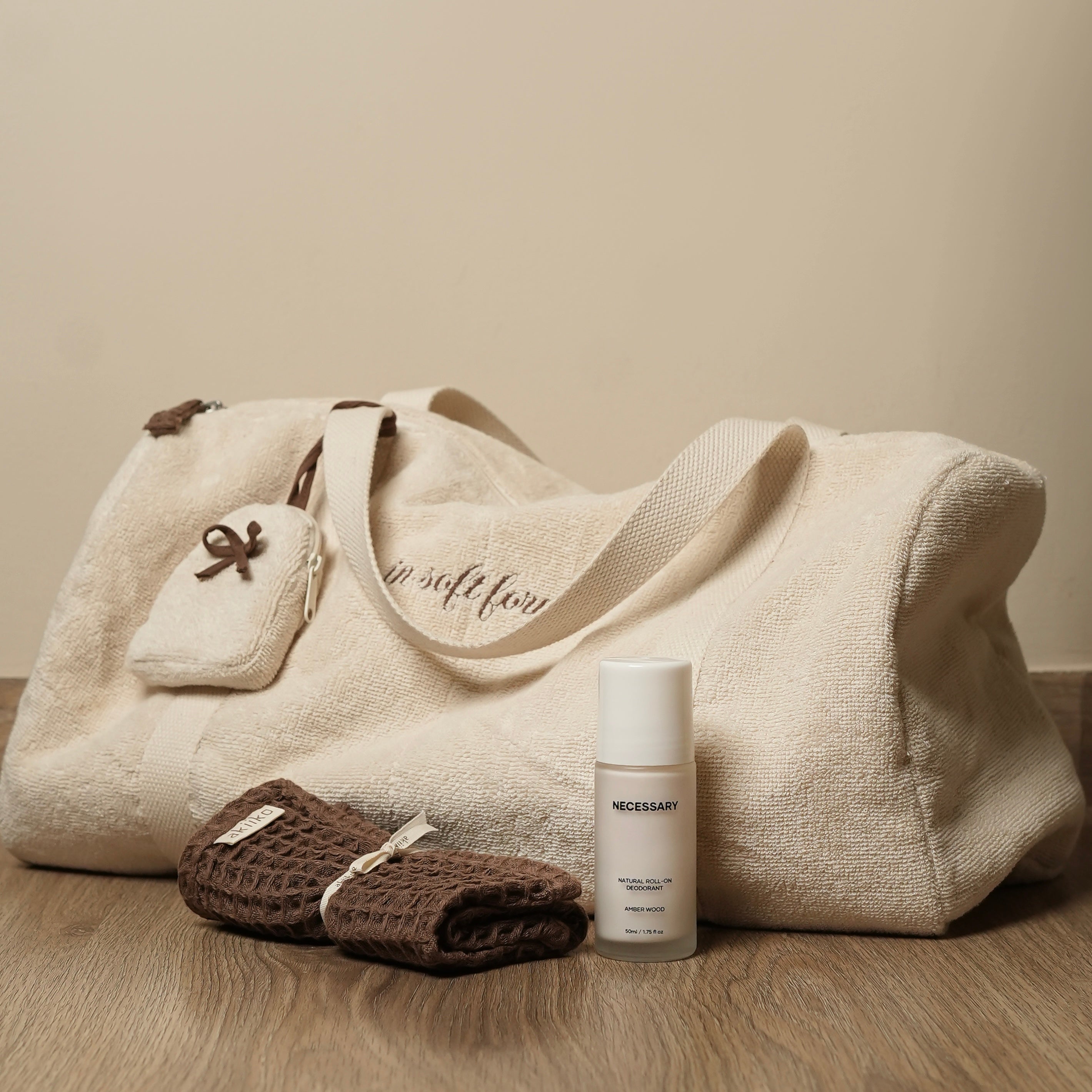SET DETAILS:1 x Terry Duffle with charm ;1 x Espresso Waffle Face Towel; 1 x Amber Wood Deo