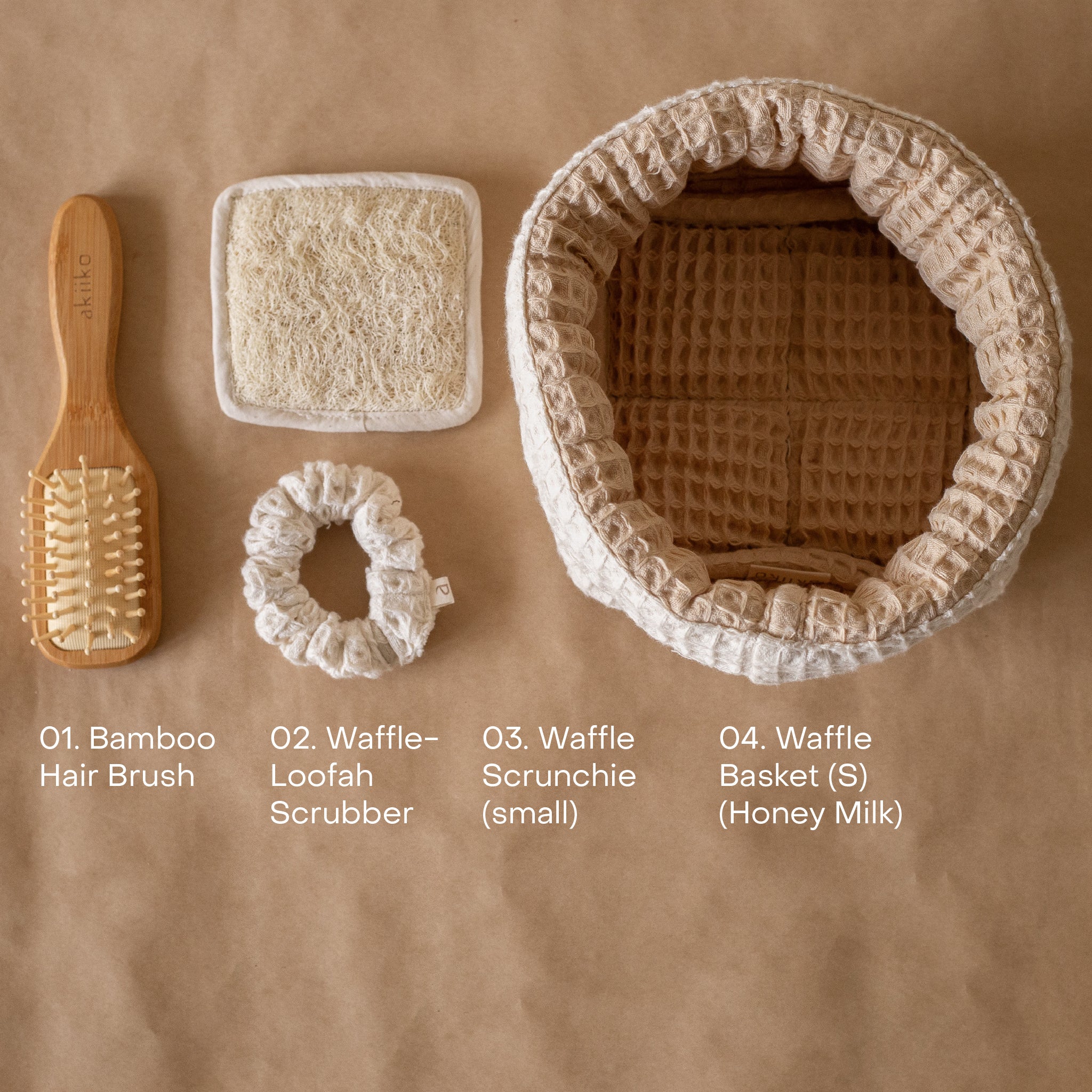 KEY FEATURES:- complete care set- includes multi purpose storage basket- eco-conscious bamboo hair brush- gentle waffle cotton scrunchie- natural loofah fibre for gentle exfoliationSET CONTENTS:1 x Honey milk waffle storage basket (small) ; 1 x Waffle scrubber ; 1 x Bamboo wooden hair brush; 1 x Waffle scrunchie