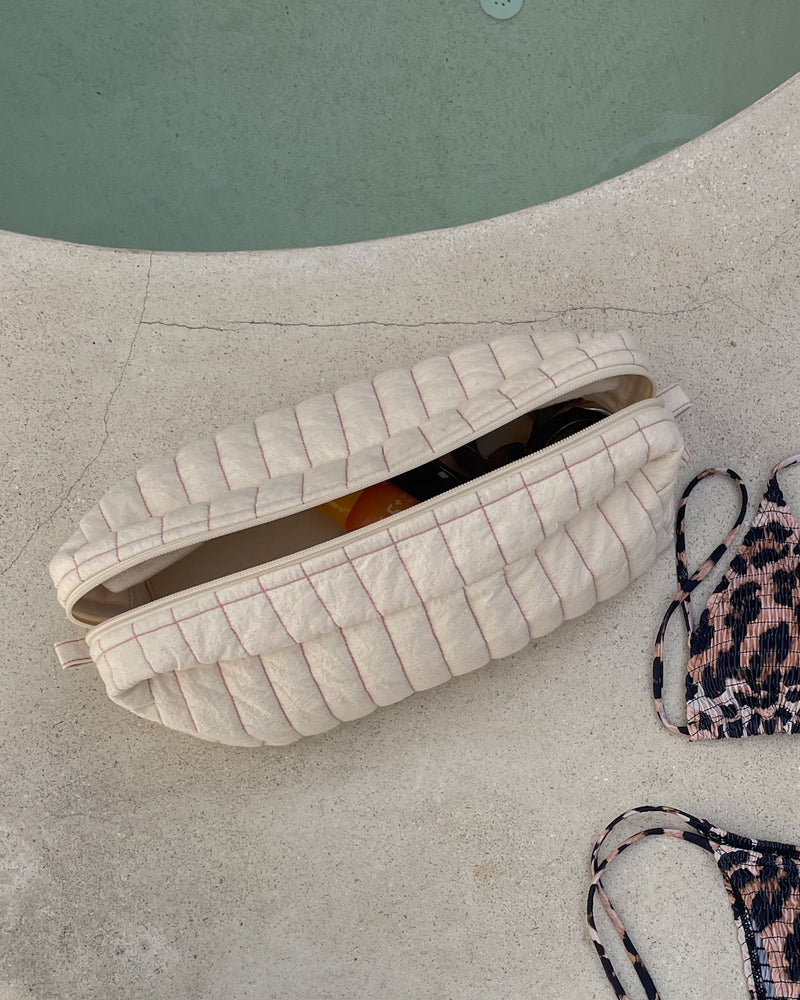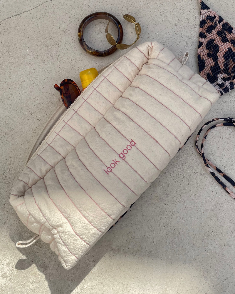 This curved pouch is perfect for storing hair tools, brushes, and beauty extras—whether you're at home or on the move. Made from crinkled cotton with sweet pink thread and finished with a gentle reminder to look good, it’s as lovely on the outside as what you keep inside.