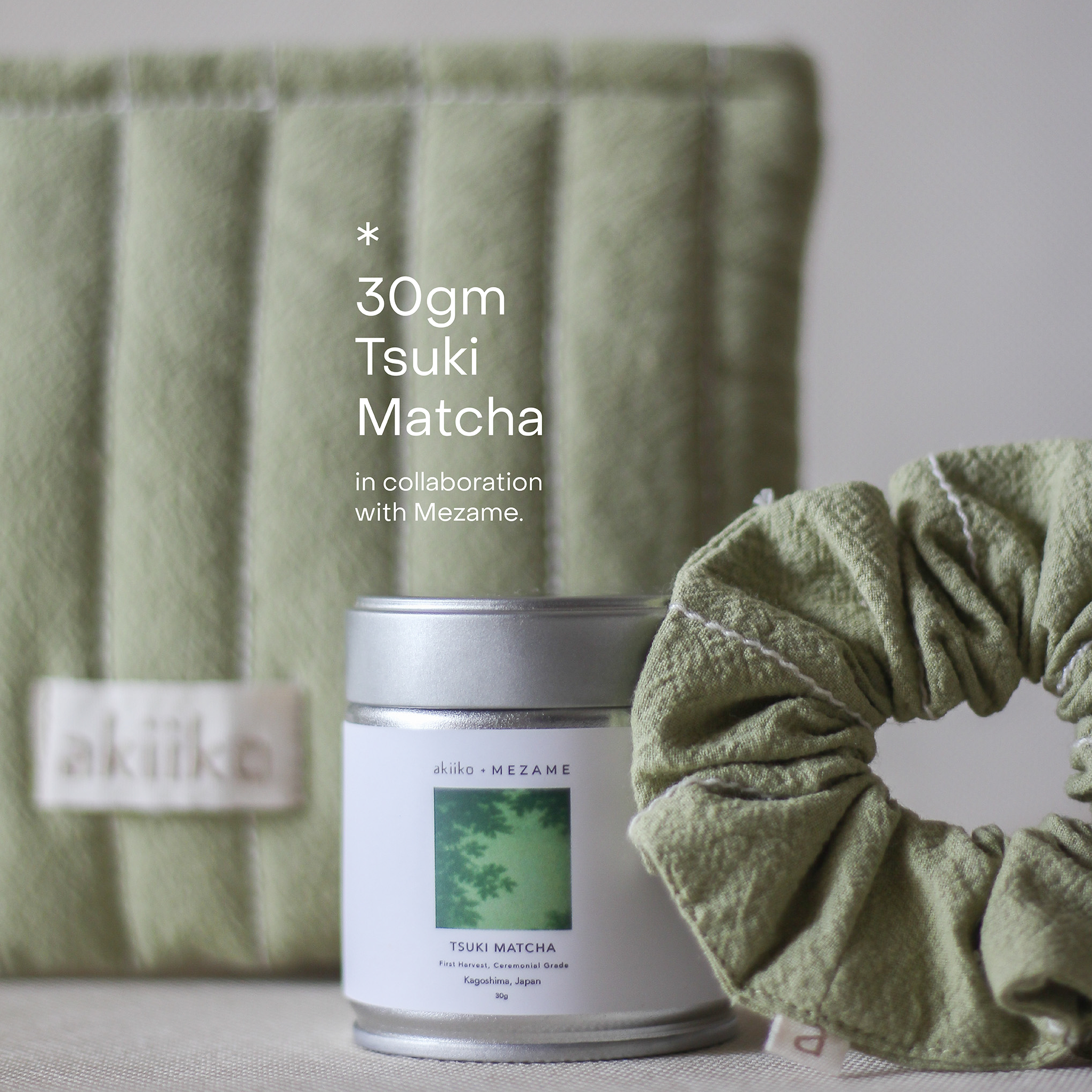 SET CONTENTS:1 x Matcha Crinkle Flat Pouch ; 1 x Matcha Crinkle Scrunchie ; 1 x Matcha Tin (30 gms)
