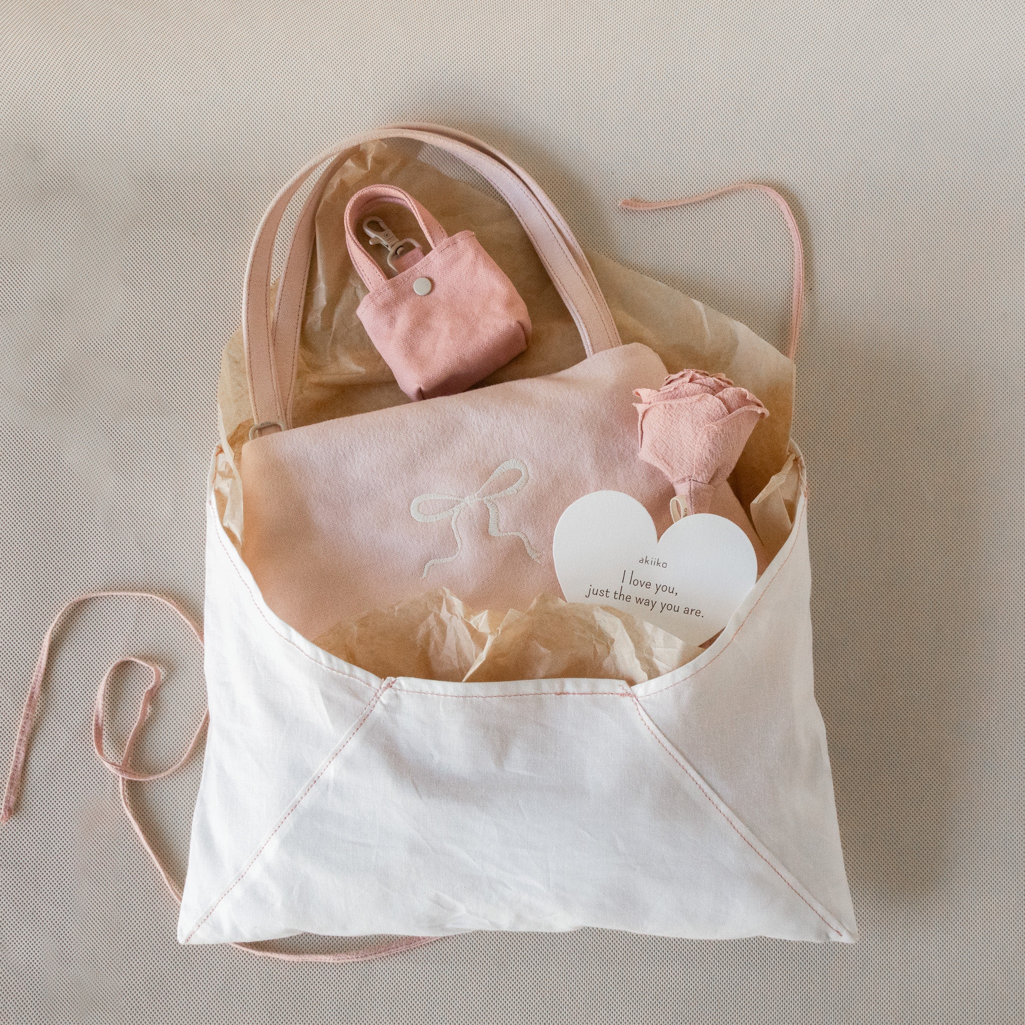 KEY FEATURES:-Soft Bow Date Bag: brushed cotton canvas, soft puffy feel, magnetic closure, inner slip pocket-Mini Date Bag Charm (Gelee): fits tiny essentials, matte aluminium dog hook, magnetic closure-Always in Bloom Rose: handmade sorbet crinkle cotton, everlasting keepsake-With Love Fabric Envelope: reusable gift-style packaging-Akiiko Heart Card: space for a personal message