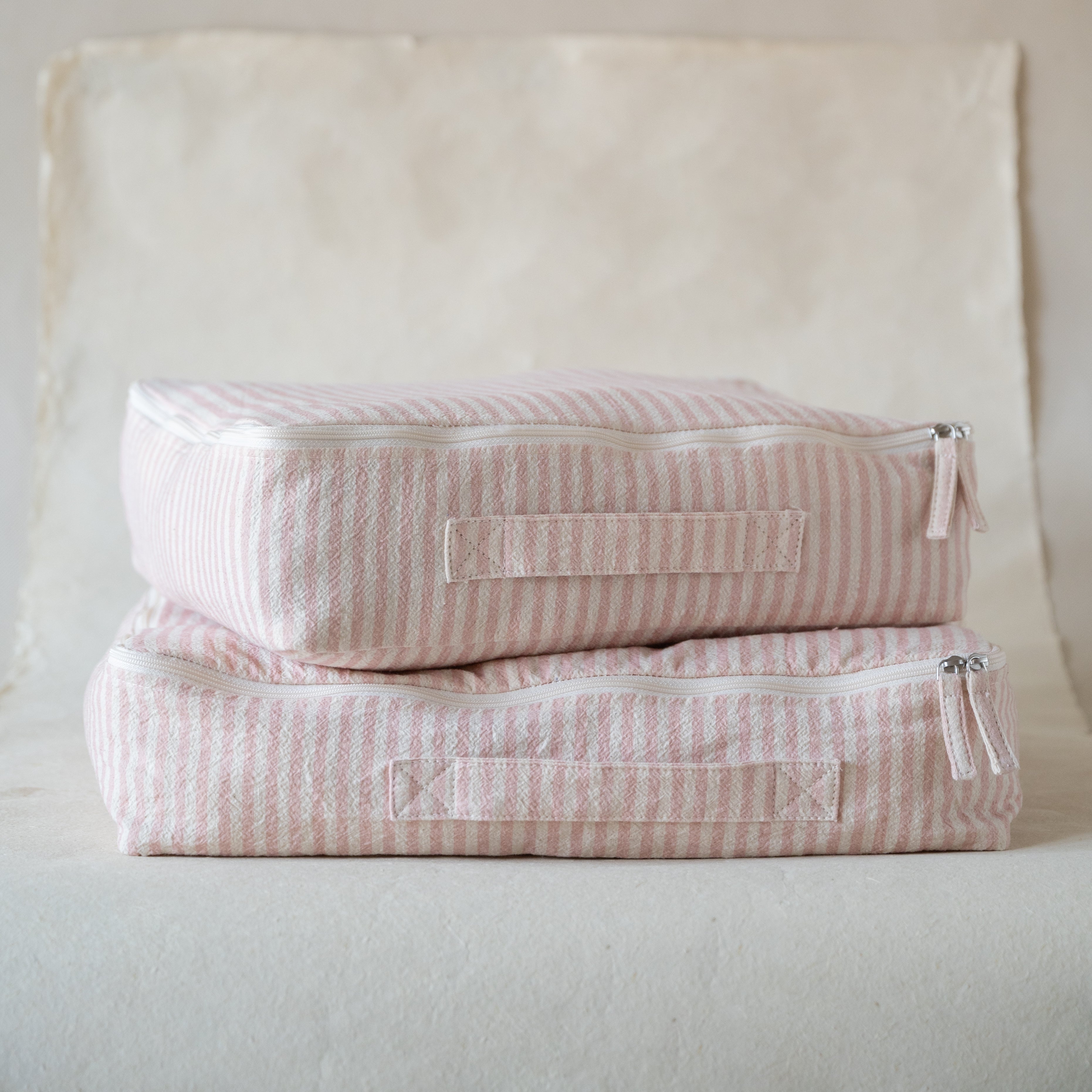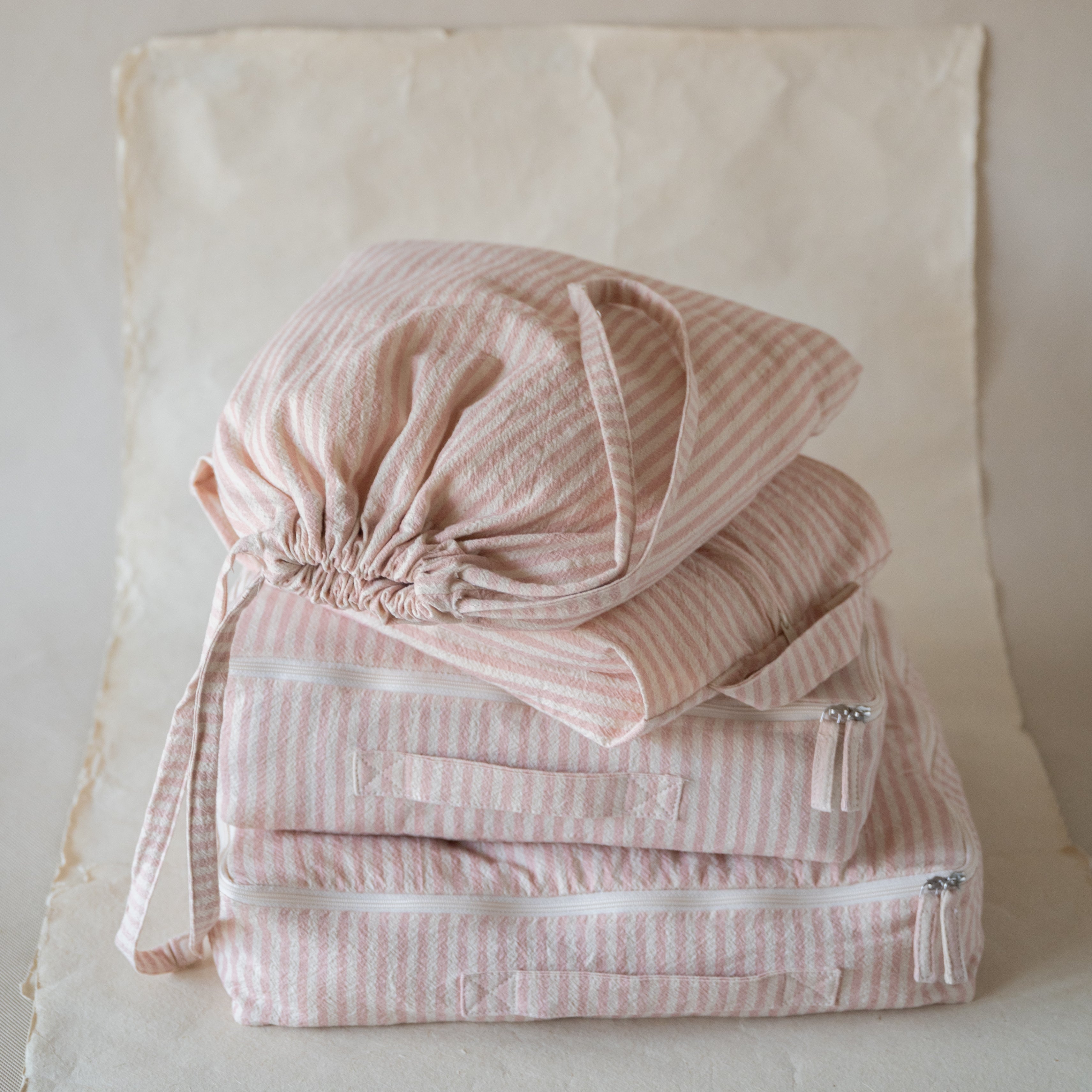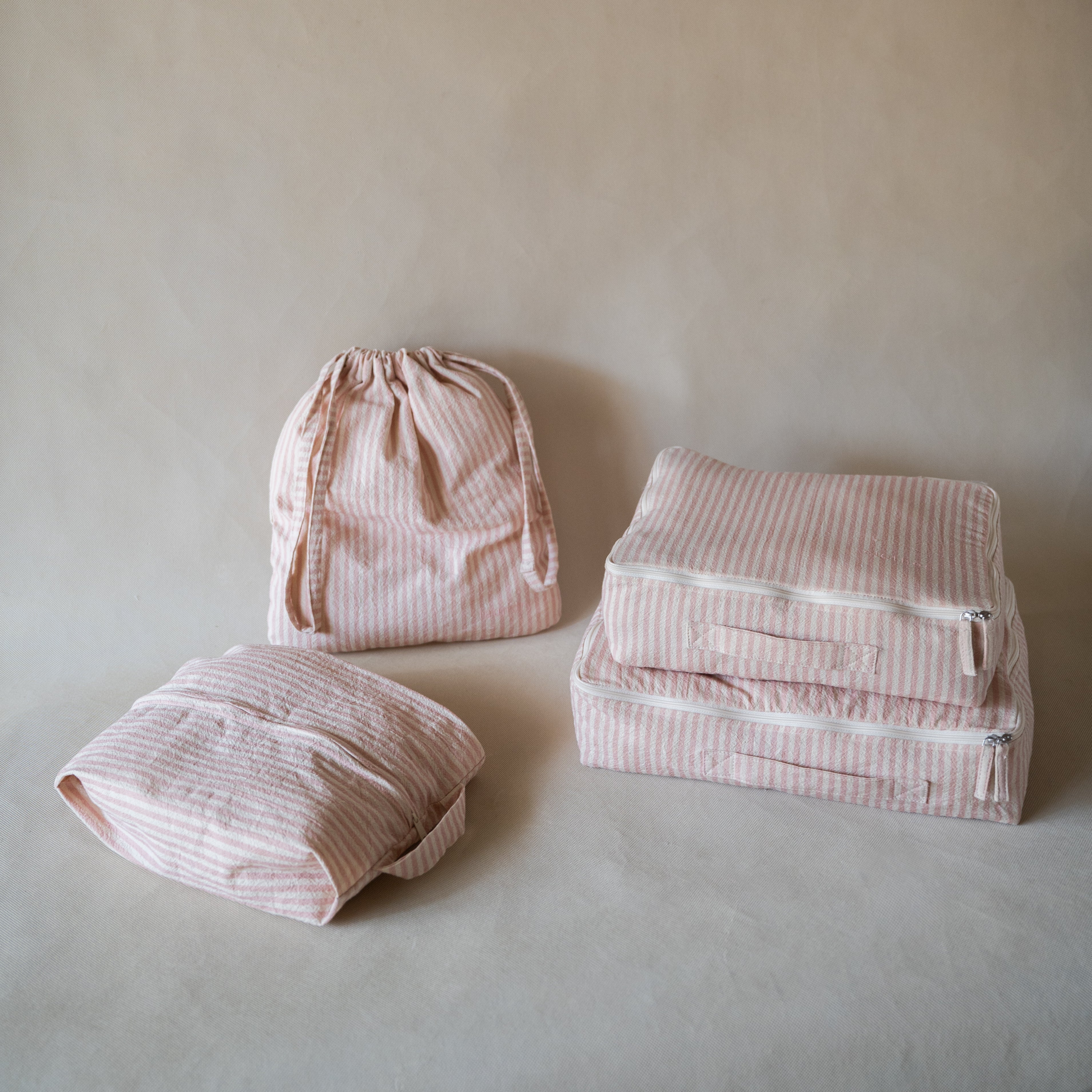 Pretty packing, made easy. This sweet four-piece set, made from soft, crinkled cotton in a petal pink striped design brings charm and order to your suitcase.