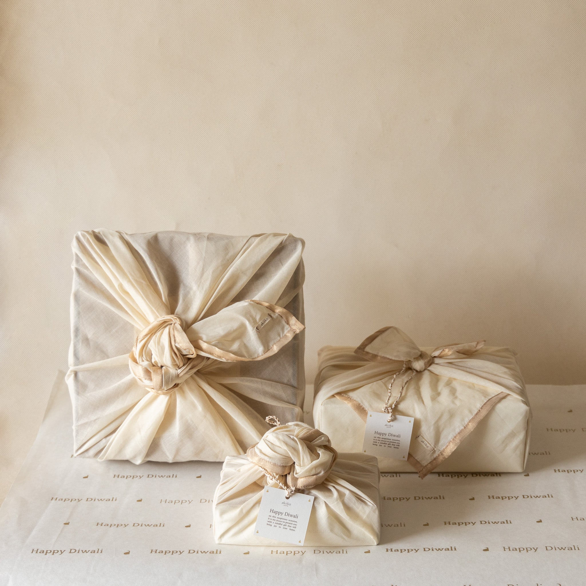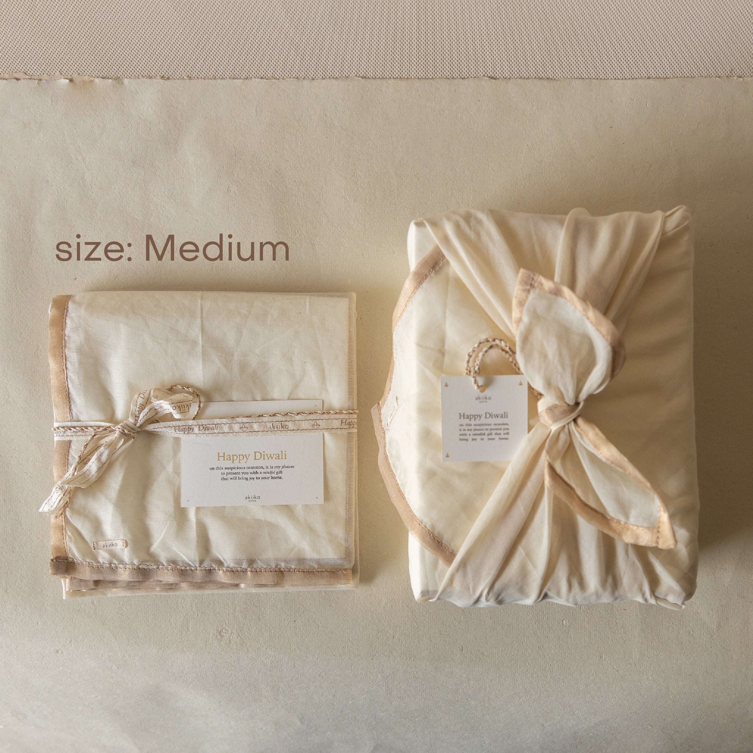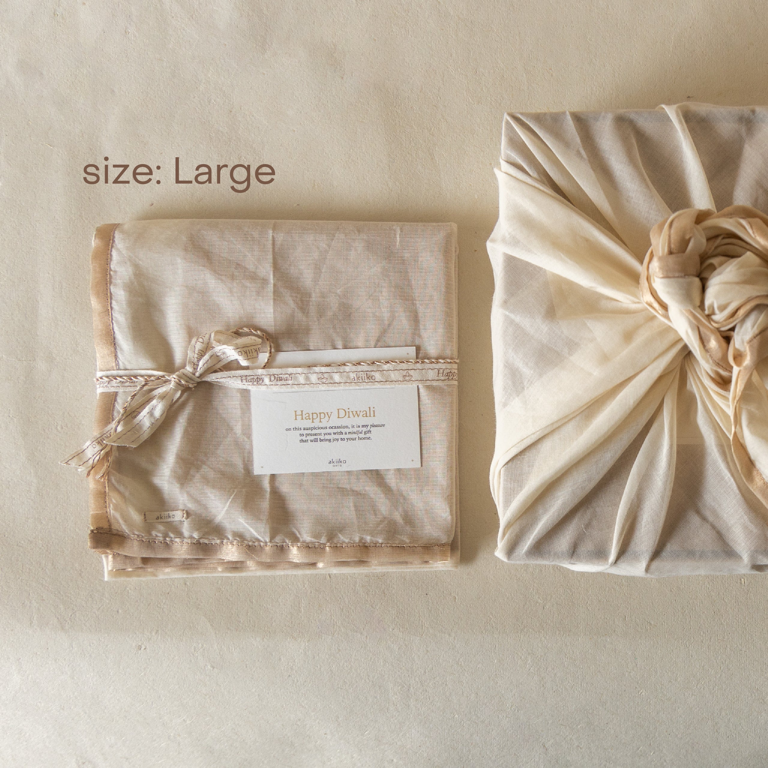 Elevate your Diwali gifting with our Soft Gold Gift Wrap, crafted from starched cotton with a delicate gold tissue edging.Designed to be wrapped any way you like, it embraces the art of furoshiki, turning every gift into a thoughtful, reusable treasure. Available in three versatile sizes, it’s perfect for small tokens or larger festive surprises, adding an artisanal shimmer to your celebrations.