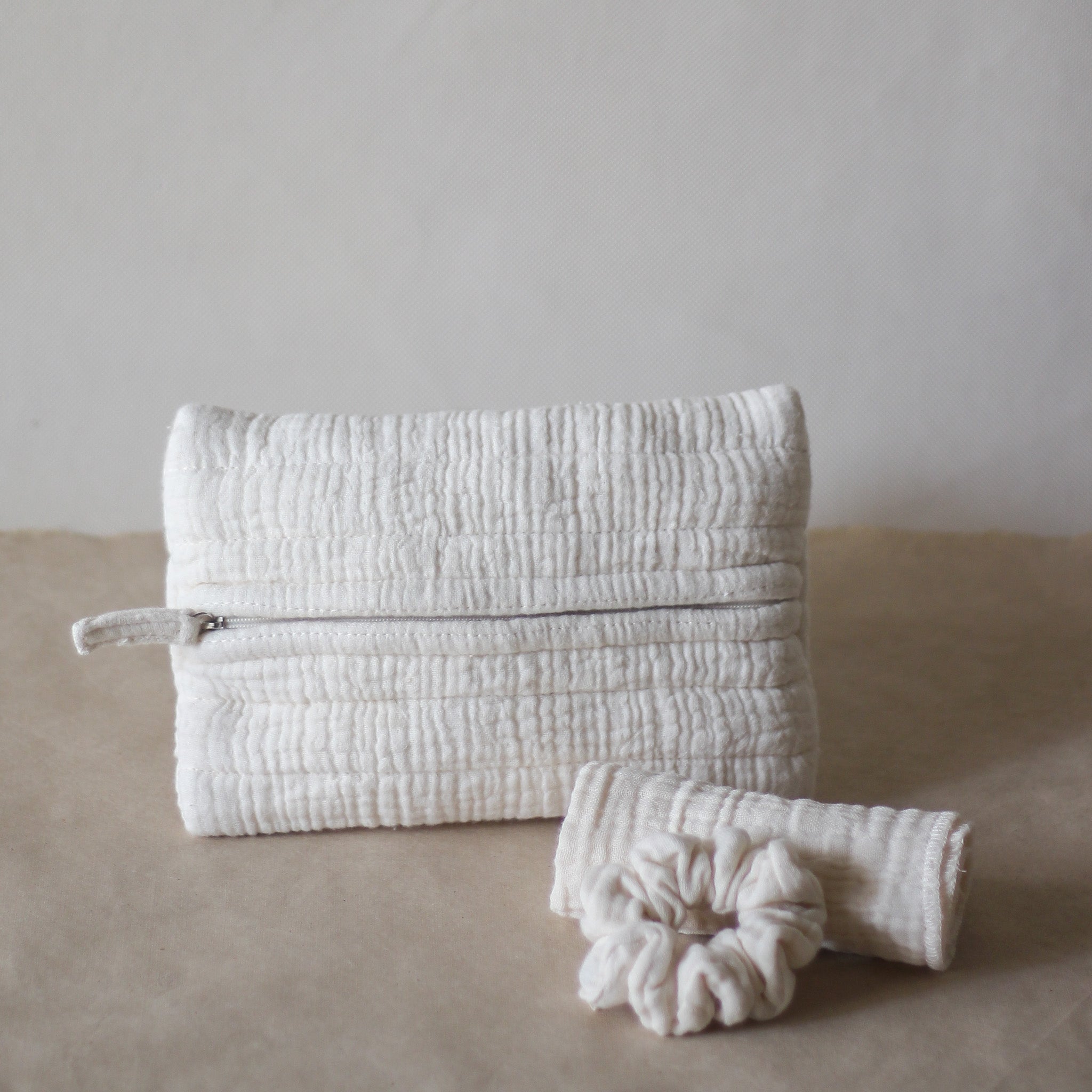 DIMENSIONS:Rectangle pouch (medium) - 22x15cm ; Scrunchie - D8cm ; Face towel- 30 x 30cm